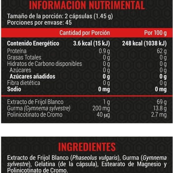 Su fórmula es a base de frijol blanco (faseolamina), está proteína evita que el cuerpo sintétice hasta un 60% de los carbohidratos ingeridos, pasando al tracto digestivo para ser expulsados a través de las heces.