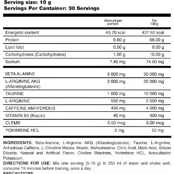 Modo de uso: Mezclé 1 scoop en 300ml de agua y consúmalo 45 minutos antes del entrenamiento.
