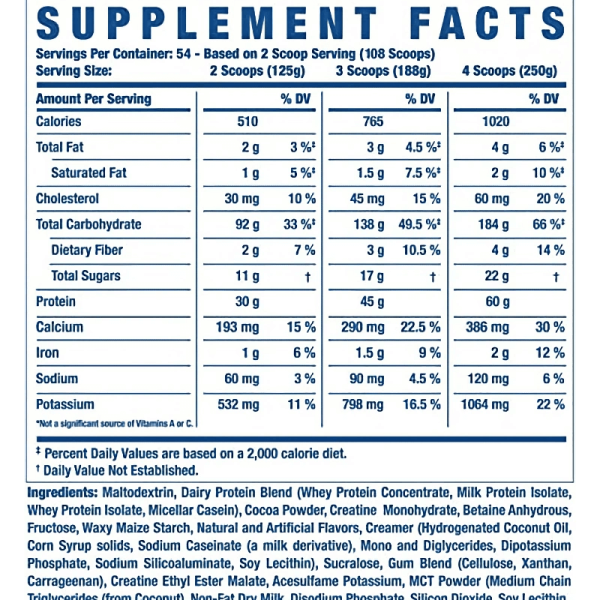 King Mass es un Mass Gainer de Ronnie Coleman, cada uno de sus 27 servicios (4 scoops) te proporcionan: 60g de una mezcla de 4 tipos de Proteína, 1,020 Calorías, 184g de Carbohidratos y 4g de Grasa.