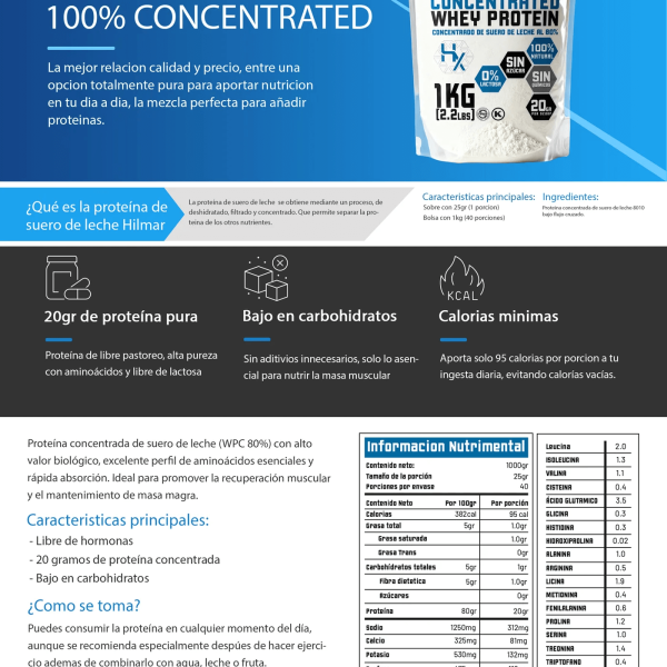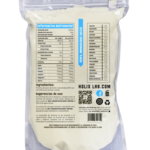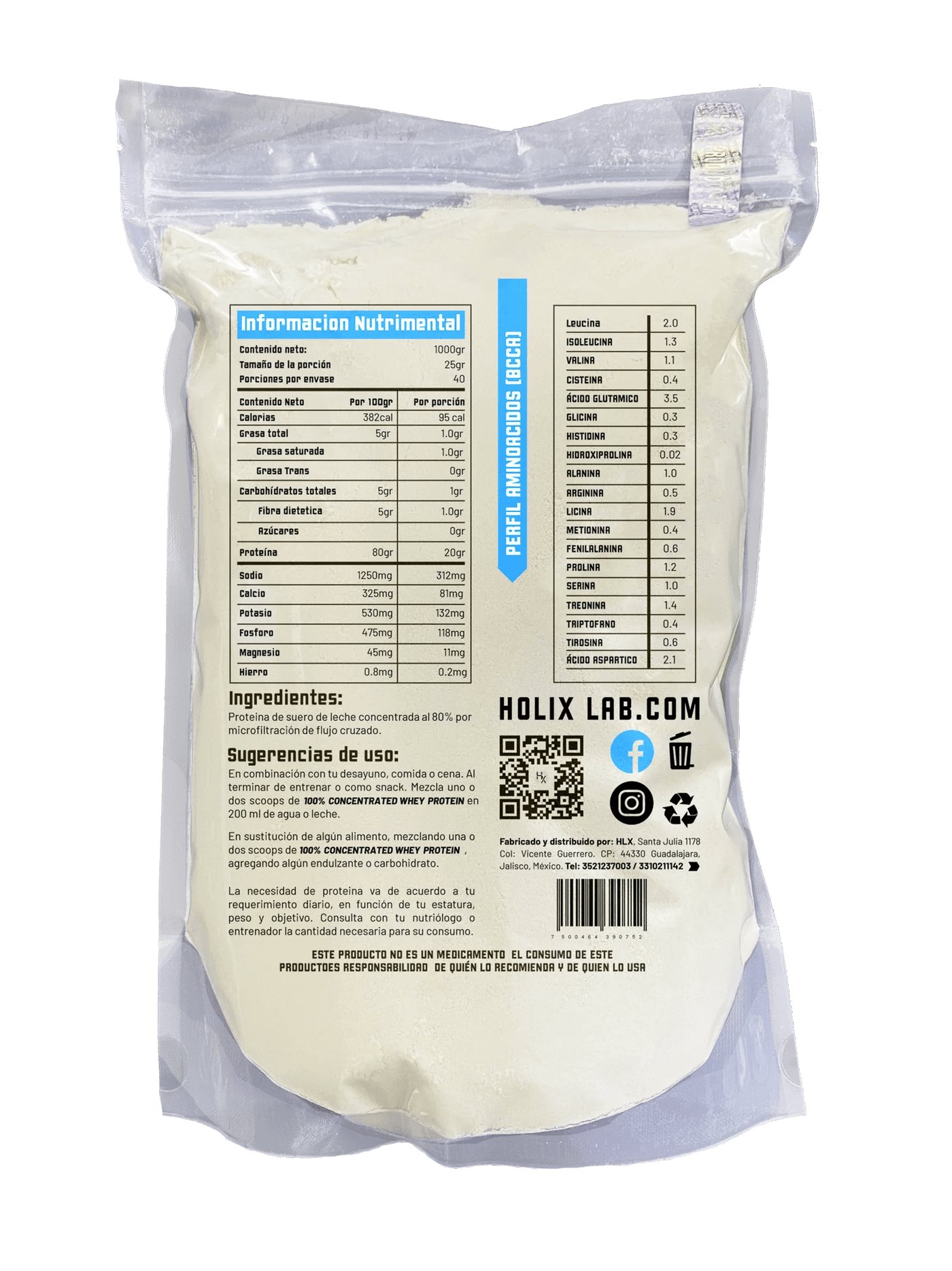 Es una 100% Whey Protein de Holix Lab, cada uno de sus 40 servicios te proporcionan: 20g de Proteína, 4.4g de BCAAs, 3.5g de Glutamina, 1g de Carbohidratos, 1g de Grasa, sin Saborizantes o Colorantes, sin Azúcar y sin Lactosa.