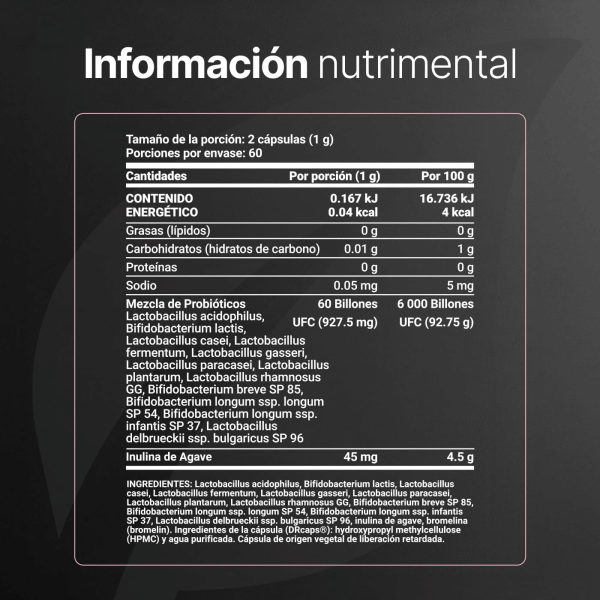 Lo que distingue a esta versión «Women» es su Matriz de Probióticos que combina 12 cepas Especializadas, apoyadas por Inulina de Agave (prebiótico) para asegurar su supervivencia. La fórmula incluye: