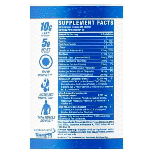 Amino Tone +EAAs de Ronnie Coleman te proporciona en cada uno de sus 30 servicios una mezcla de: 5g de BCAAs 2:1:1, 5g de EAAs, 2.7g de su complejo de rendimiento y rehidratación (Taurina, Fosfato de Potasio, Citrato de Sodio, Fosfato de Magnesio, Vitamina B-12, Vitamina B-1 y Vitamina B-2), y 3.1g de su complejo para la perdida de peso sin estimulantes (L-Alanina, L-Carnitina Tartrate, CLA, Bitartrato de Colina).