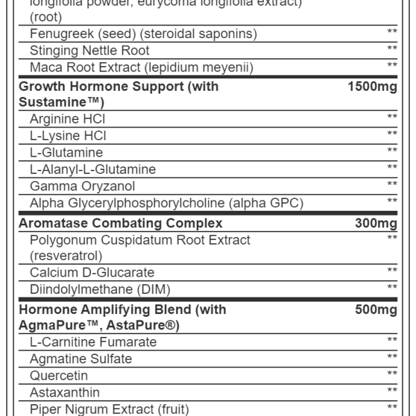 Su completa formulación incluye 6 complejos: Complejo ZMA, Complejo Pro-Testosterona, Complejo Pro-Hormona de Crecimiento (GH), Complejo Inhibidor de Aromatasa, Complejo Amplificador Hormonal, Complejo Reconstituyente (Protector Hepático).