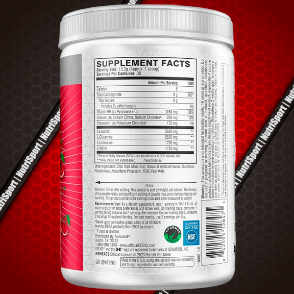 BCAAs XTEND de Scivation te proporciona en cada uno de sus 30 servicios: 7g de BCAAs, 2.5g de Glutamina, 1.14g de su complejo de electrolitos y 1g de Citrulina.