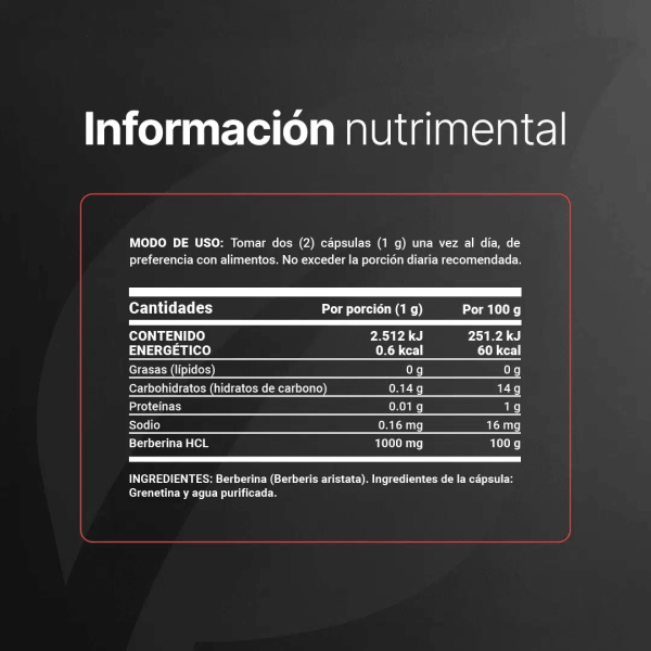 Modo de uso: La berberina tiene una vida corta en el cuerpo, por lo que se recomienda dividir la dosis total en 3 tomas de 500mg a lo largo del día, de preferencia con comida o 30 minutos antes de está.