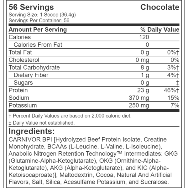 Carnivor es una Proteína de Carne Hidrolizada de MuscleMeds, cada uno de sus 56 servicios te proporcionan: 23g de Proteína, 8g de Carbohidratos, 2.5g de Creatina, 0g de Grasa, sin Azúcar y sin Colesterol.
