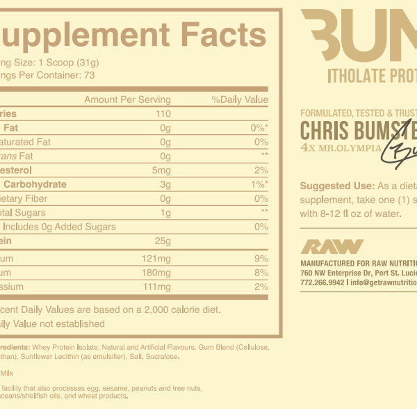 CBUM Itholate es una 100% Whey Protein Isolate de RAW, cada uno de sus 73 servicios te proporcionan: 25g de Proteína, 5.7g de BCAAs, 4.4g de Glutamina, 3g de Carbohidratos y 0g de Grasa.