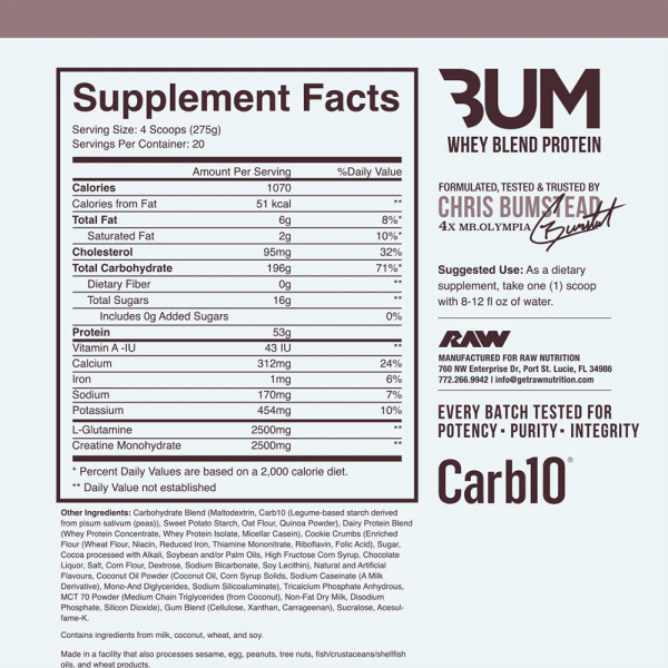 CBUM Mass Gainer de RAW te aporta en cada uno de sus 20 servicios (4 scoops): 53g de una mezcla de 3 tipos de Proteína, 1,070 Calorías, 195g de Carbohidratos, 6g de Grasa y 2.5g de Creatina Monohidratada.