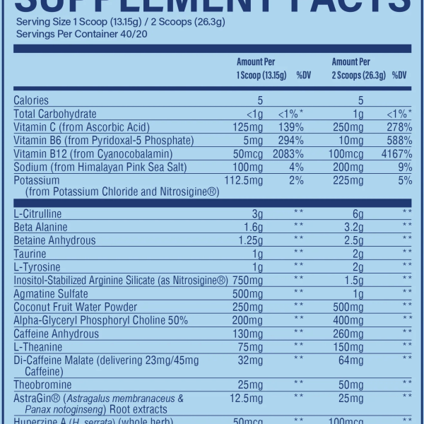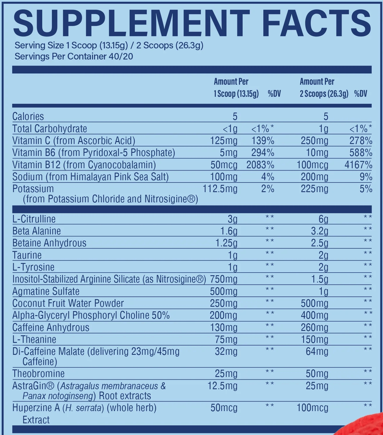 Contiene (por 2 scoops) 260mg de cafeína anhidra y 64mg de malato de dicafeína.