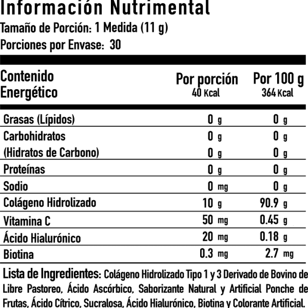 El Colágeno Hidrolizado de LimitX te proporciona en cada uno de sus 30 servicios: 10g de Colágeno Hidrolizado, Vitamina C, Ácido Hialurónico y Biotina.