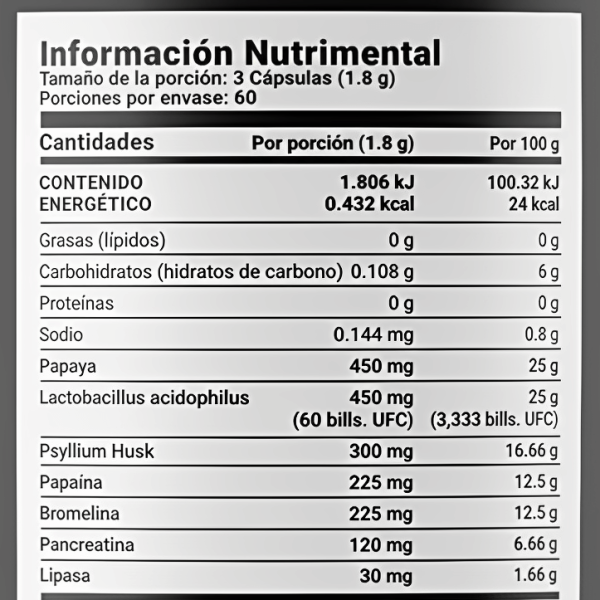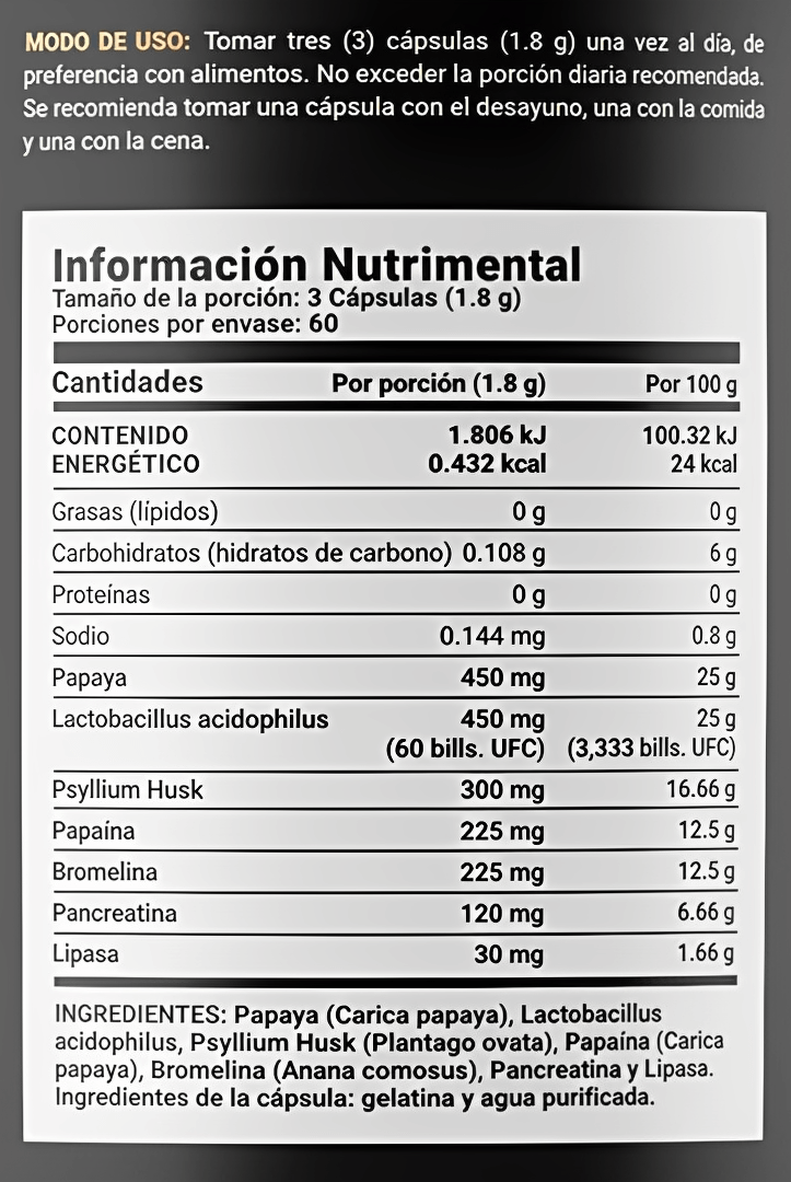 Papaína (extracto de Papaya): Enzima proteolítica, se especializa en descomponer las proteínas facilitando su digestión.