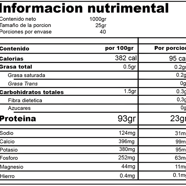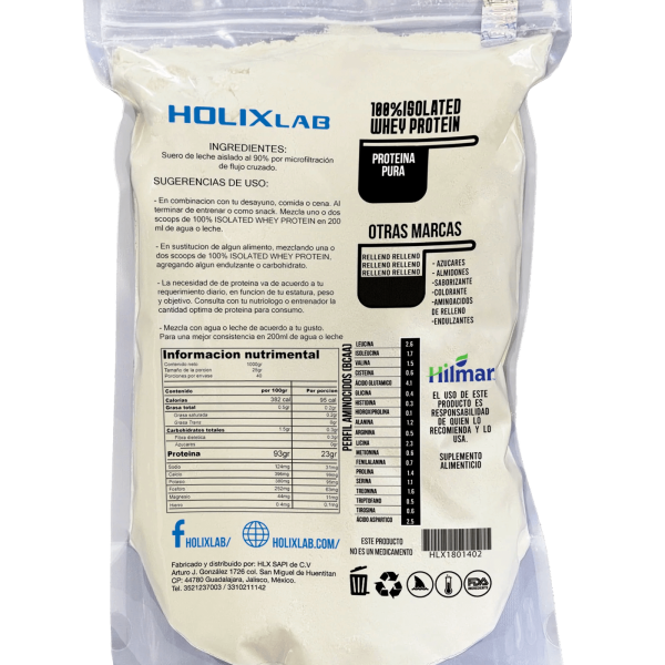 Es una 100% Whey Protein Isolate de Holix Lab, cada uno de sus 40 servicios te proporcionan: 23g de Proteína, 5.8g de BCAAs, 4.1g de Glutamina, 0.3g de Carbohidratos, 0.2g de Grasa, sin Saborizantes o Colorantes, sin Azúcar y sin Lactosa.