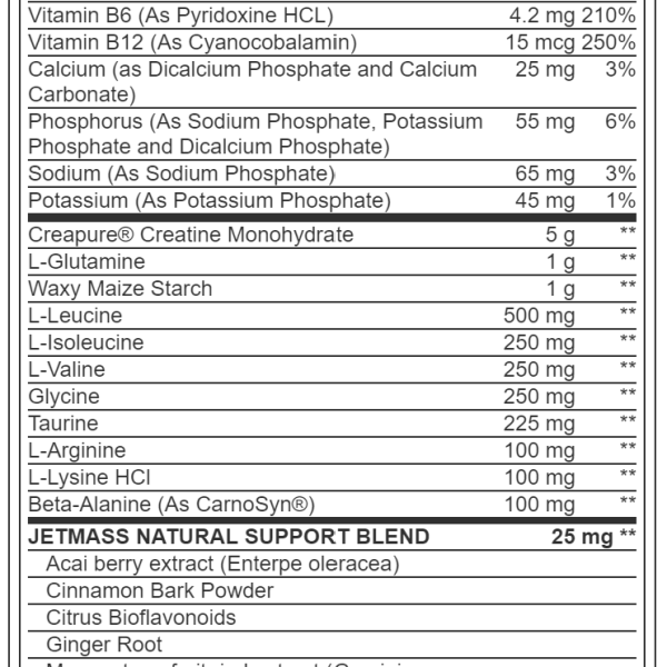 JetMass es un recuperador de GAT que destaca por ofrecerte: 5g de Creatina, 1g de Glutamina, 1g de BCAAs, 500mg de Taurina, Arginina y Beta Alanina, y 200mg de Electrolitos.