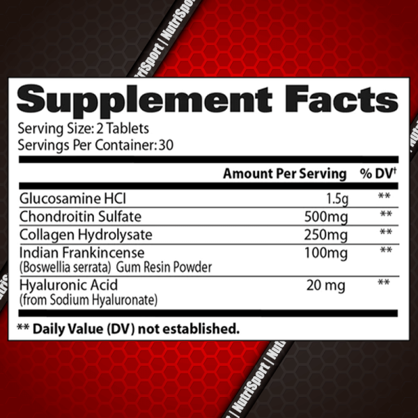 Joint Support de GAT es un coctel diseñado para proteger y reparar las articulaciones, cada uno de sus 30 servicios (2 Tabs) te proporciona: 1.5g de Glucosamina + 500mg de Condroitina + 250mg de Colágeno Hidrolizado + 100mg de Indian Frankincense + 20mg de Ácido Hialurónico.