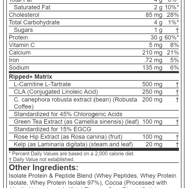 NitroTech Ripped es una mezcla de Whey Protein Isolate y Whey Protein Concentrate de MuscleTech, cada uno de sus 42 servicios te proporcionan: 30g de Proteína, 4g de Carbohidratos, 4g de Grasa, 500mg de L-Carnitina, 250mg de CLA, 200mg Robusta Coffee y 100mg Green Tea.