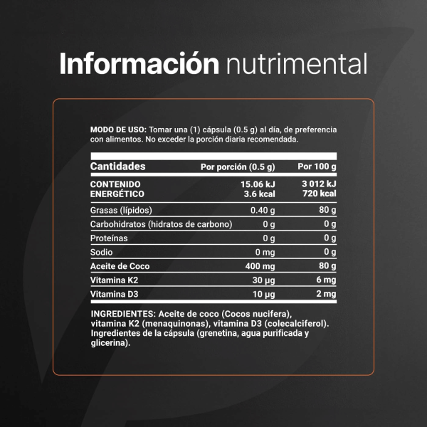Aceite de Coco (400 mg): Este es el vehículo de la fórmula y ocupa la mayor parte de la cápsula. Al ser la Vitamina D3 y la K2 nutrientes liposolubles (que solo se disuelven y absorben en presencia de grasa), los 400 mg de aceite de coco actúan como el medio de transporte ideal para garantizar una biodisponibilidad superior. A diferencia de las tabletas secas que el cuerpo a menudo desecha sin procesar, esta base lipídica asegura que las vitaminas atraviesen la pared intestinal y lleguen al torrente sanguíneo, maximizando la eficiencia de cada dosis sin necesidad de ingerir la cápsula con una comida copiosa.